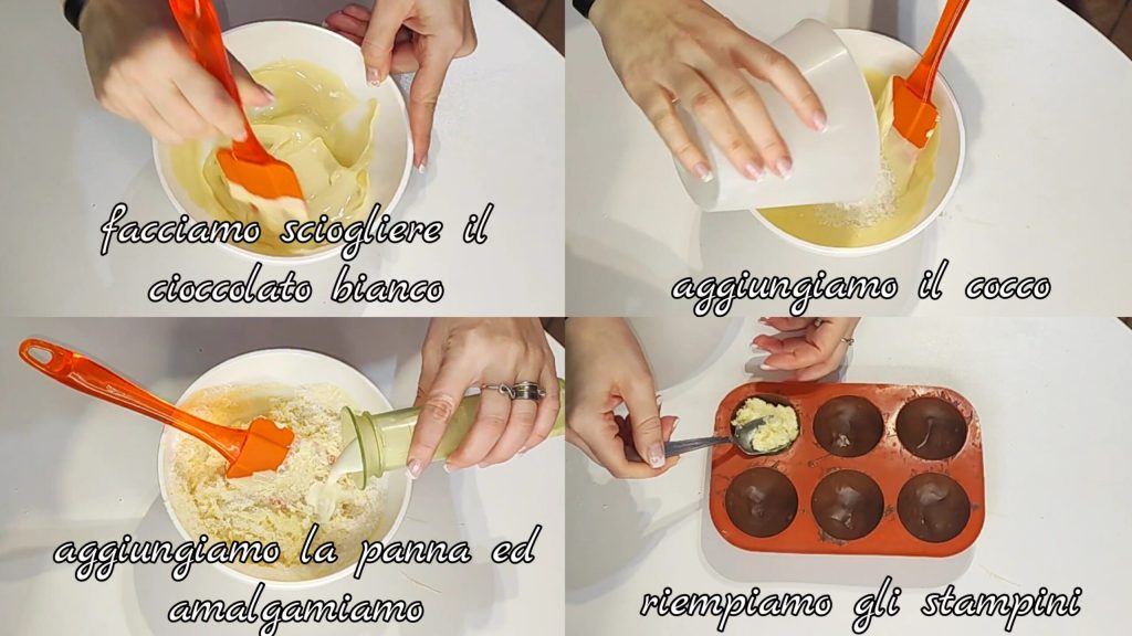 Étant donné que mes chocolats au chocolat blanc fourrés vous ont beaucoup plu, je vous propose une autre version faite avec du chocolat au lait et fourrée d’un mélange de chocolat blanc, noix de coco et crème, un vrai délice 🤤 surtout si vous êtes amateurs de chocolats Bounty et évidemment de noix de coco, vous devez les essayer. Ces chocolats se préparent de manière simple et rapide et comme je vous l’ai déjà dit pour les autres, vous pouvez également choisir d’utiliser divers moules avec différentes formes à votre guise ou selon ce que vous avez déjà à la maison.