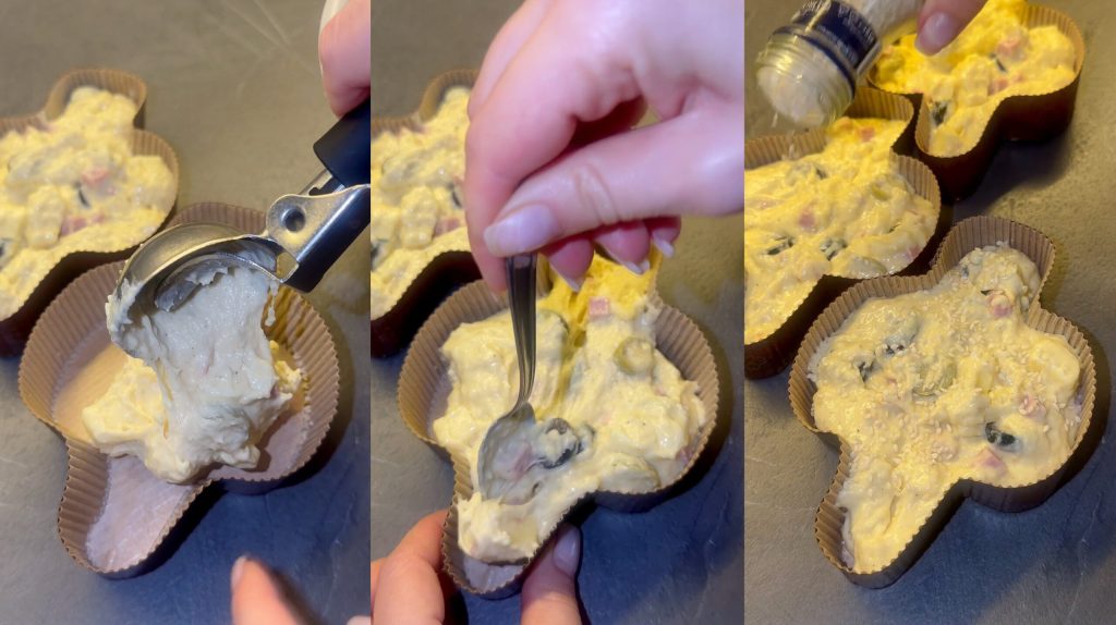 Je verse la préparation dans les moules pour mini-colombines.