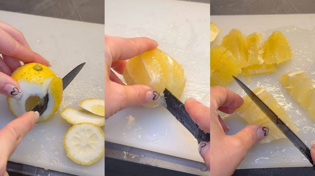 Lavez très bien les citrons. Enlevez complètement le zeste et toute la partie blanche, en ne laissant que la pulpe. Retirez également les filaments internes et les pépins, puis coupez la pulpe des citrons en morceaux.