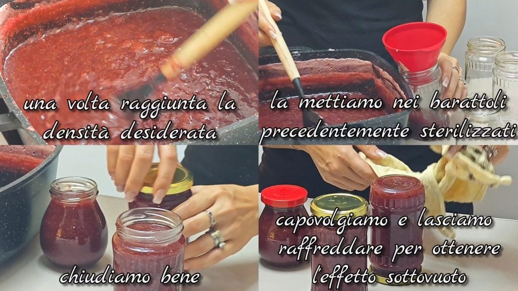 Une fois la densité souhaitée atteinte, mettons-la immédiatement dans les bocaux préalablement stérilisés. Fermons bien et retournons les bocaux pour obtenir l’effet sous vide.
