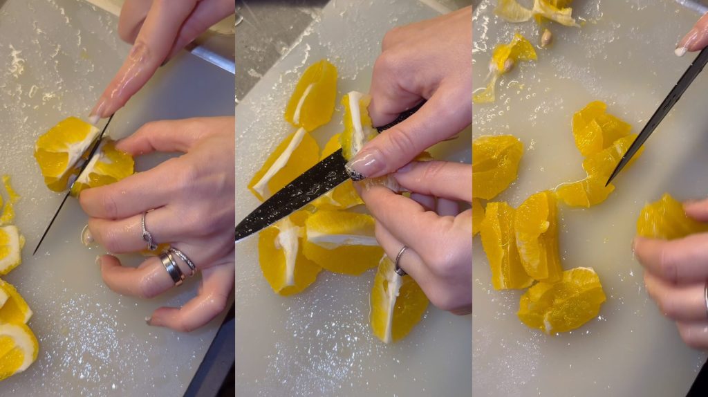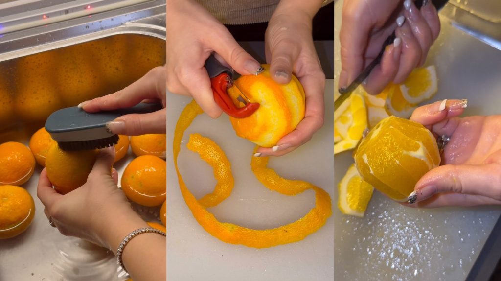 Lavez bien les oranges sous l’eau courante. Retirez la peau la plus fine possible avec un éplucheur. Éliminez la partie blanche (albédo) pour éviter l’amertume.