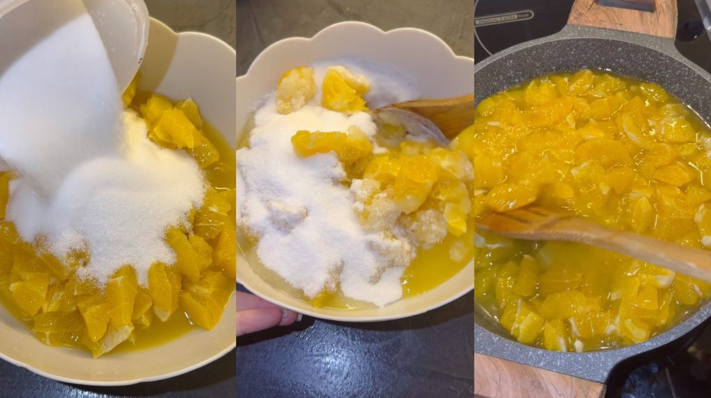 Coupez les oranges, retirez les éventuels pépins et filaments internes. Coupez la pulpe en morceaux et transférez-la dans une grande casserole.