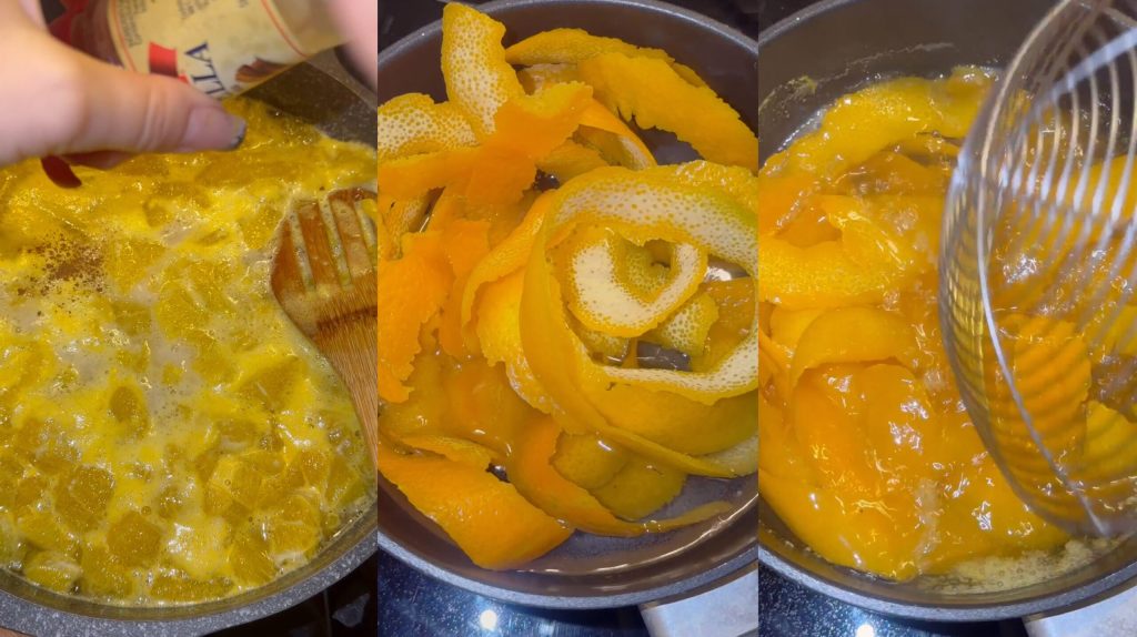Ajoutez l’arôme de vanille et une pincée de cannelle. Laissez cuire en mélangeant de temps en temps. Préparez les écorces : Pendant ce temps, faites blanchir les écorces pendant 2-3 minutes.