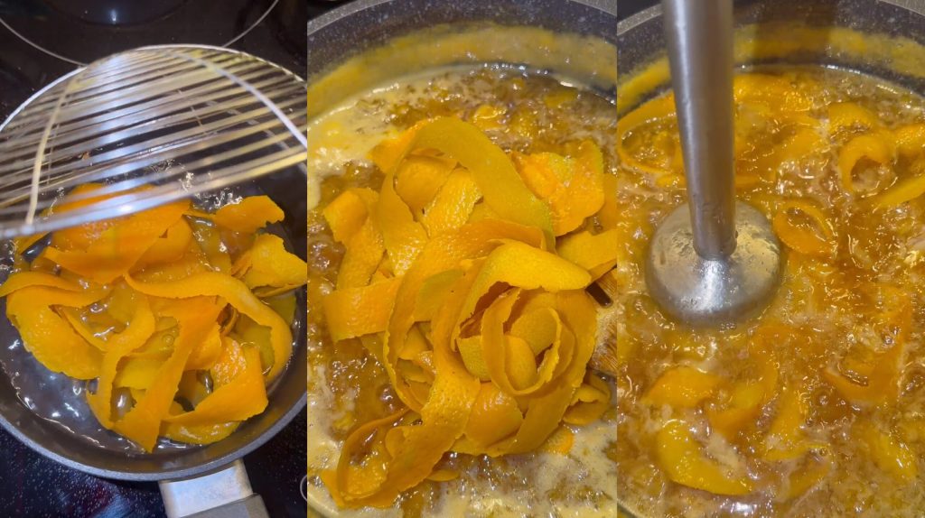 Changez l’eau et répétez l’opération 2-3 fois pour éliminer l’amertume. Ajoutez les écorces blanchies à la confiture. Mixez avec un mixeur plongeant jusqu’à la consistance désirée.