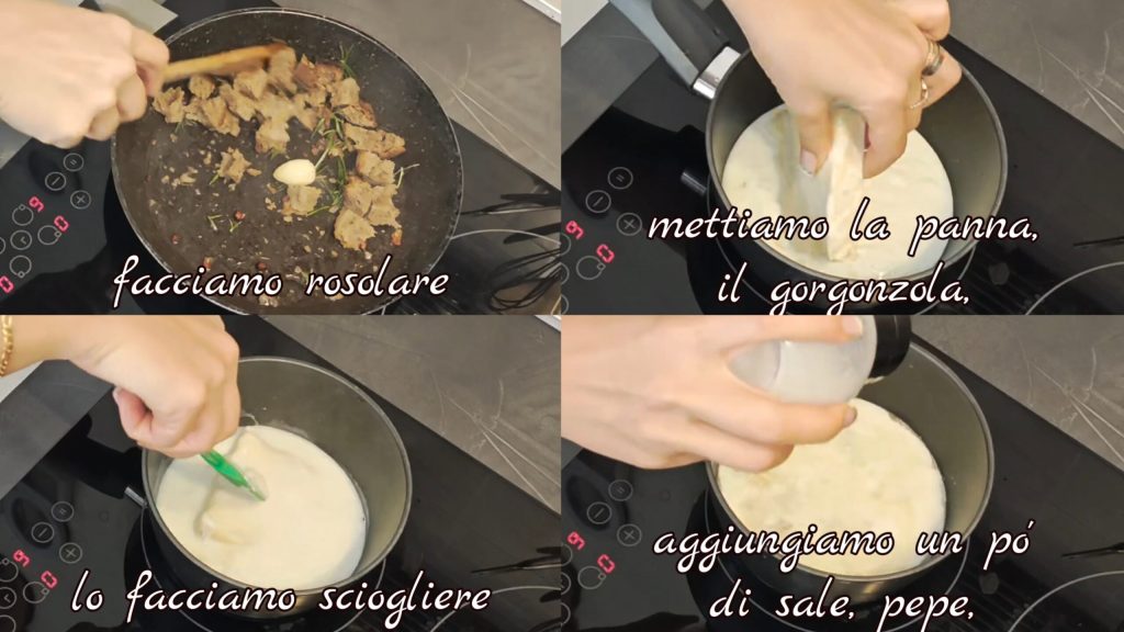 faisons revenir (si nécessaire, ajoutons encore un peu d’huile). Pendant ce temps, dans une autre casserole, mettons la crème, le gorgonzola et faisons fondre. Ajoutons sel et poivre à notre goût