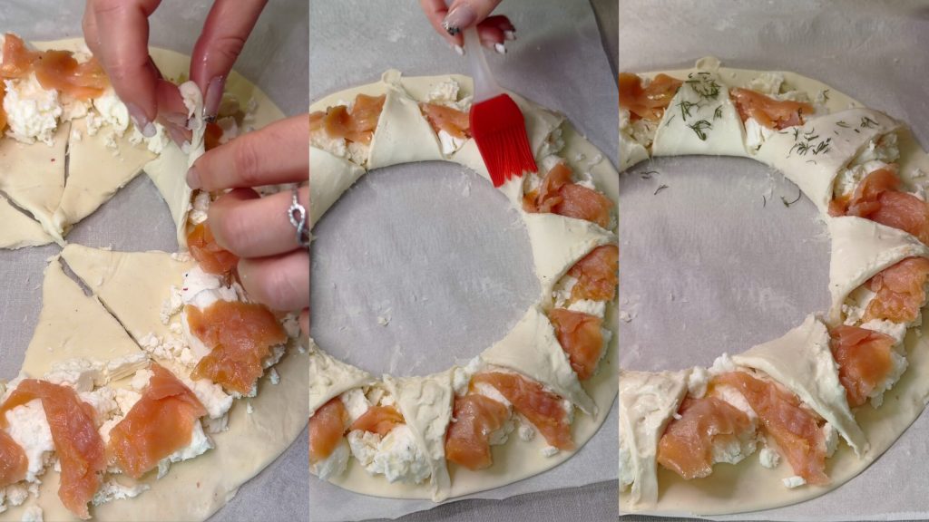 Pour la préparation de la Couronne de Noël en pâte feuilletée salée avec saumon et feta, regardez la vidéo ICI.