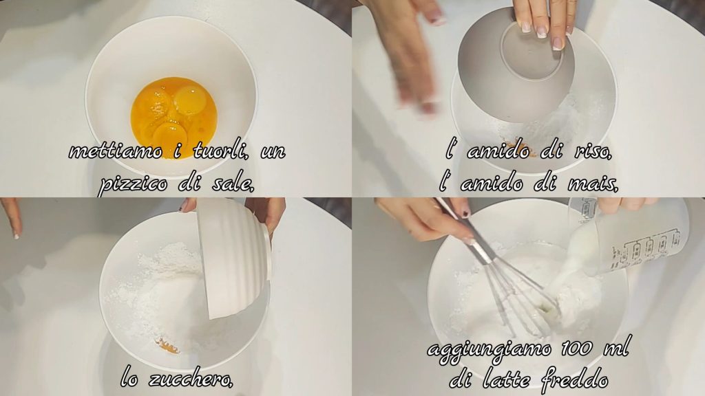 Dans un récipient adapté à la cuisson au micro-ondes, mettons les jaunes d’œufs, une pincée de sel, l’amidon de riz, l’amidon de maïs, le sucre, 100 ml de lait froid.