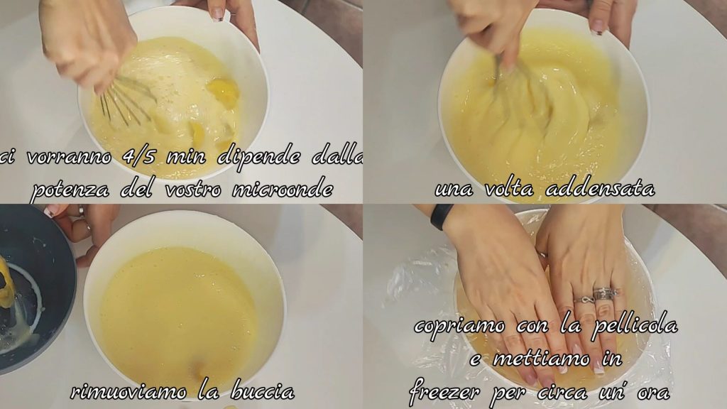 (cela prendra 4/5 min selon la puissance de votre micro-ondes). Une fois épaissie, retirons le zeste, couvrons avec un film alimentaire et mettons-la (là où c’est possible) au congélateur pendant environ une heure pour la refroidir immédiatement et éviter l’augmentation de la charge microbienne ! Si vous ne pouvez pas la mettre au congélateur, mettez-la à refroidir au frigo ou dans un récipient avec de l’eau et des glaçons !