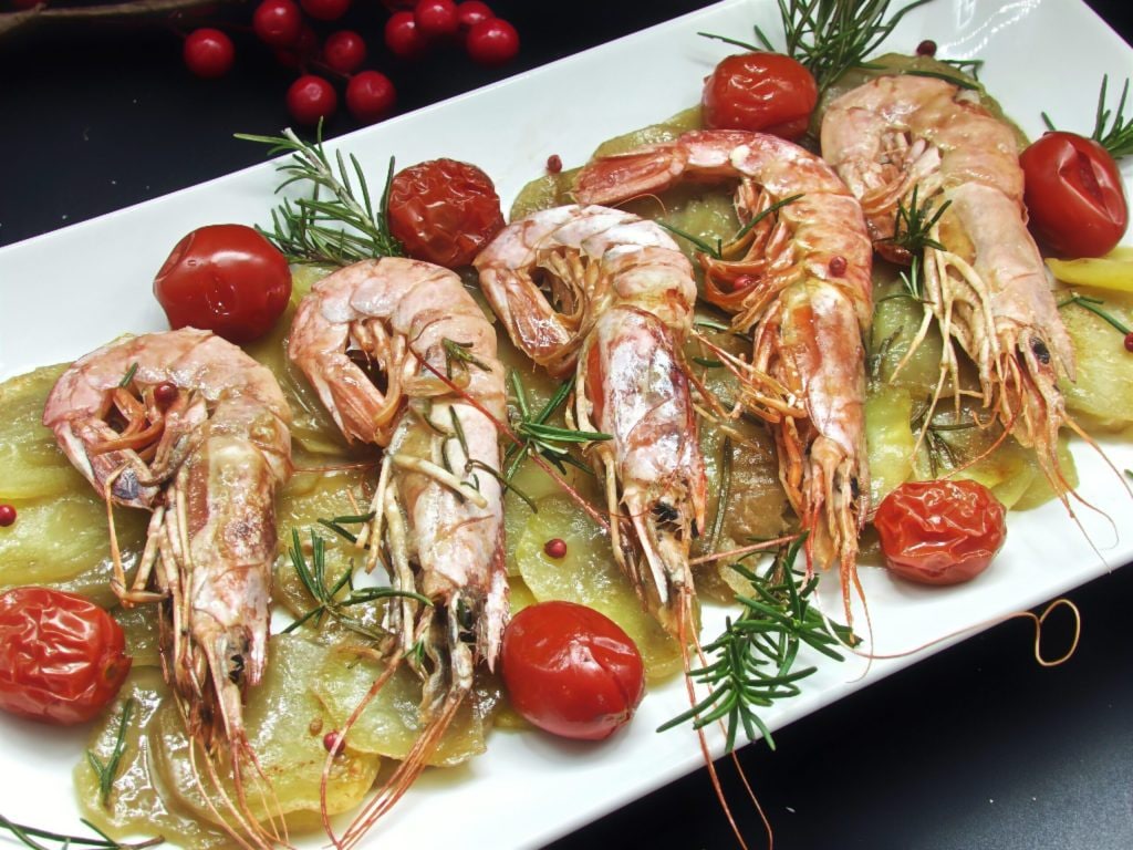 Crevettes géantes avec pommes de terre et tomates cerises