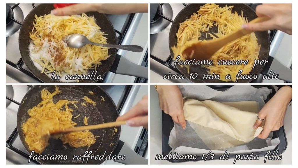 la cannelle et faisons cuire environ 10 min en remuant de temps en temps. Nous éteignons et laissons refroidir. Dans un moule avec du papier cuisson, nous mettons environ 1/3 de la pâte filo.