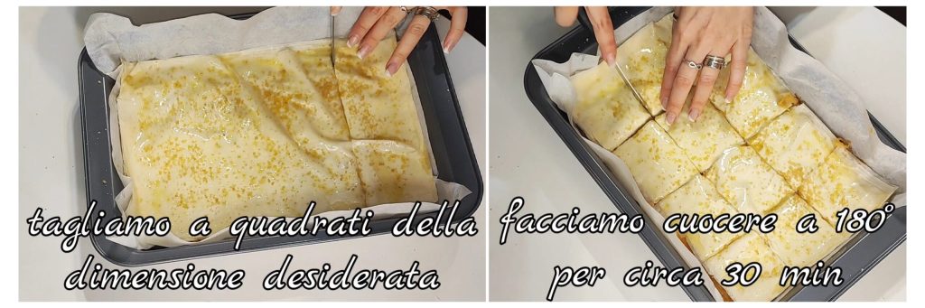 Nous coupons en carrés de la taille désirée et faisons cuire à 180°C pendant environ 30 min.