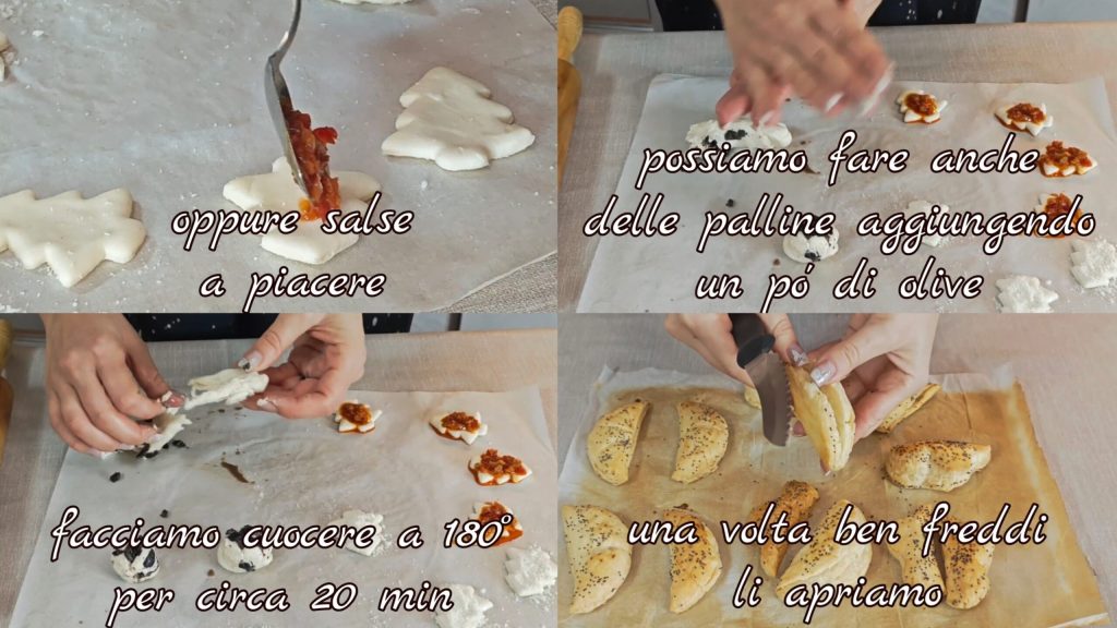 Si vous le souhaitez, vous pouvez ajouter des sauces à votre goût. Avec le reste de pâte, vous pouvez faire des petites boules en ajoutant quelques olives. Faites-les cuire à 180°C pendant environ 20 minutes. Une fois bien refroidis, ouvrez-les.
