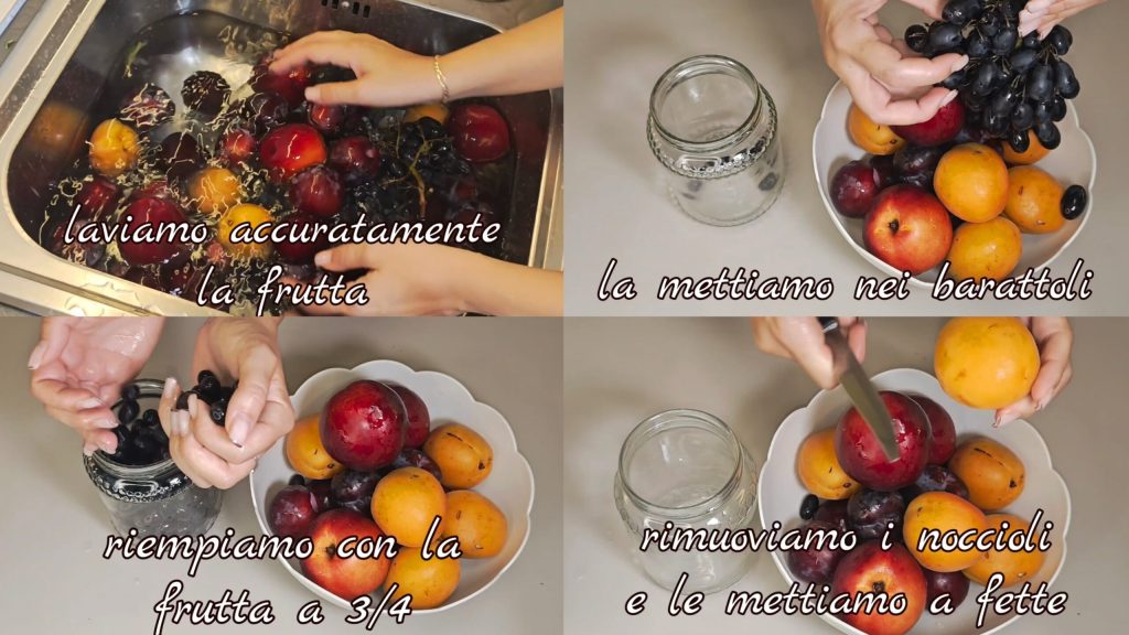 ou nous mélangeons plusieurs types de fruits. Pendant ce temps, nous faisons bouillir l’eau avec le sucre pour le dissoudre, puis nous couvrons les fruits dans les bocaux.