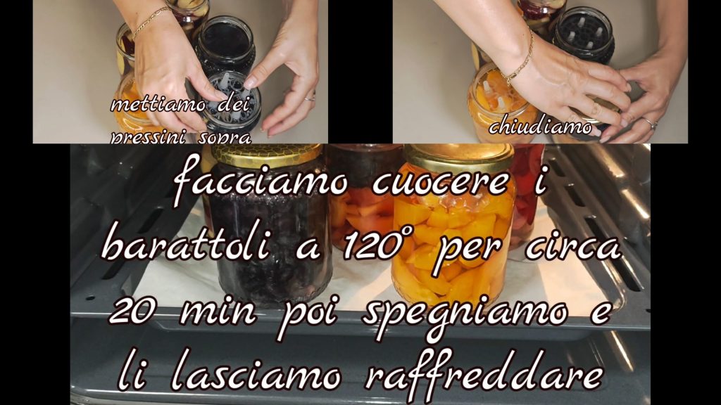 Nous mettons des poids sur le dessus pour maintenir les fruits couverts d’eau. Ensuite, nous les fermons et les mettons au four à 120°C pendant environ 20 minutes, puis nous éteignons et les laissons refroidir complètement sans ouvrir la porte.
