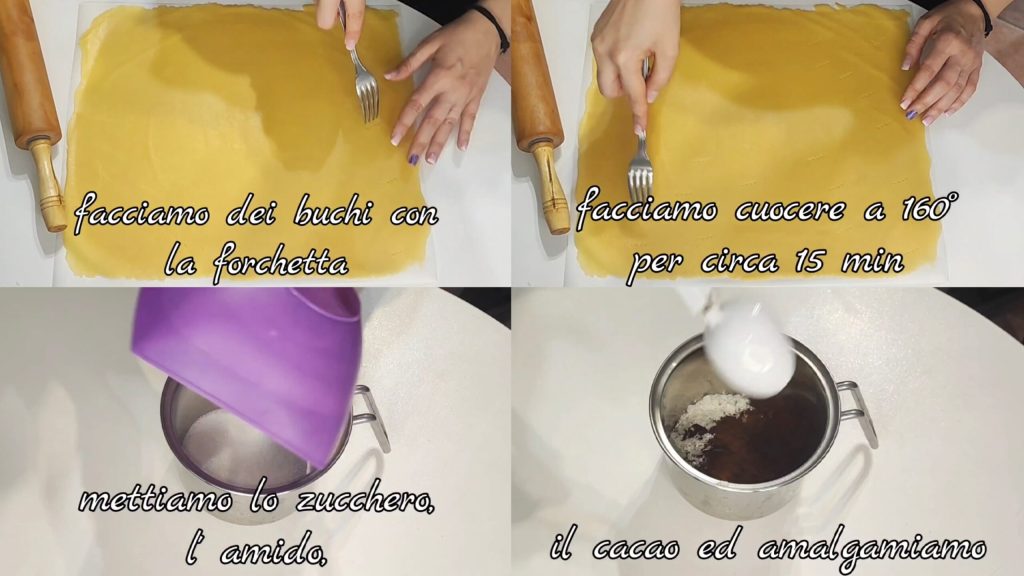 Faisons des trous avec une fourchette puis faisons cuire à 160° pendant environ 15 minutes. Continuons avec les deux autres morceaux de la même manière. Dans une casserole, mettons le sucre, l’amidon, le cacao et mélangeons.