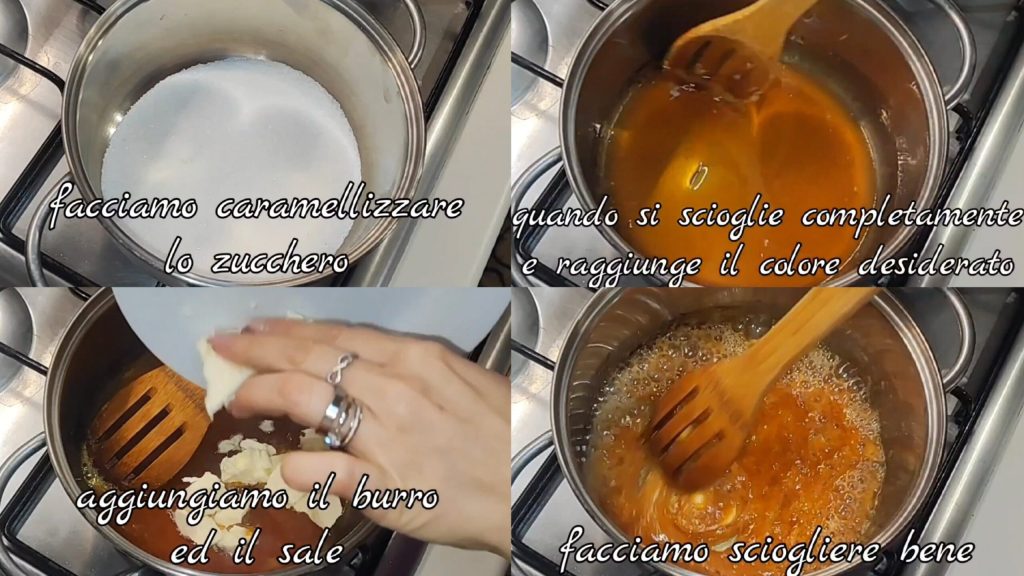 Dans une petite casserole, faites caraméliser le sucre, une fois complètement fondu et atteint la couleur désirée, ajoutez le beurre et le sel et laissez fondre.