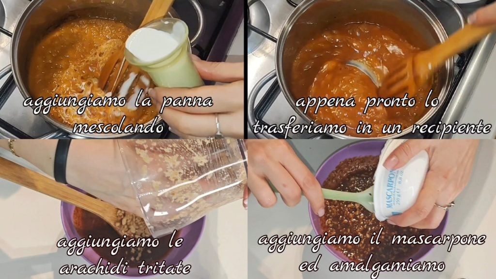 • Ajoutez la crème en remuant. Dès qu’il est prêt, transférez-le dans un récipient. Ajoutez les cacahuètes hachées et le mascarpone.