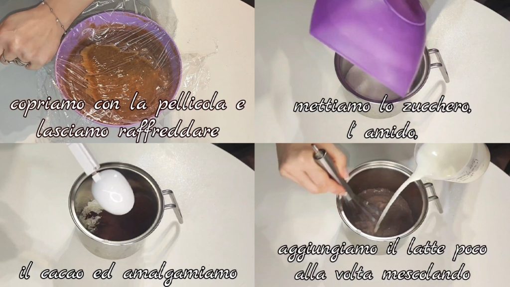 Mettez le sucre, l’amidon, le cacao et mélangez. Ajoutez le lait petit à petit en remuant pour éviter la formation de grumeaux.