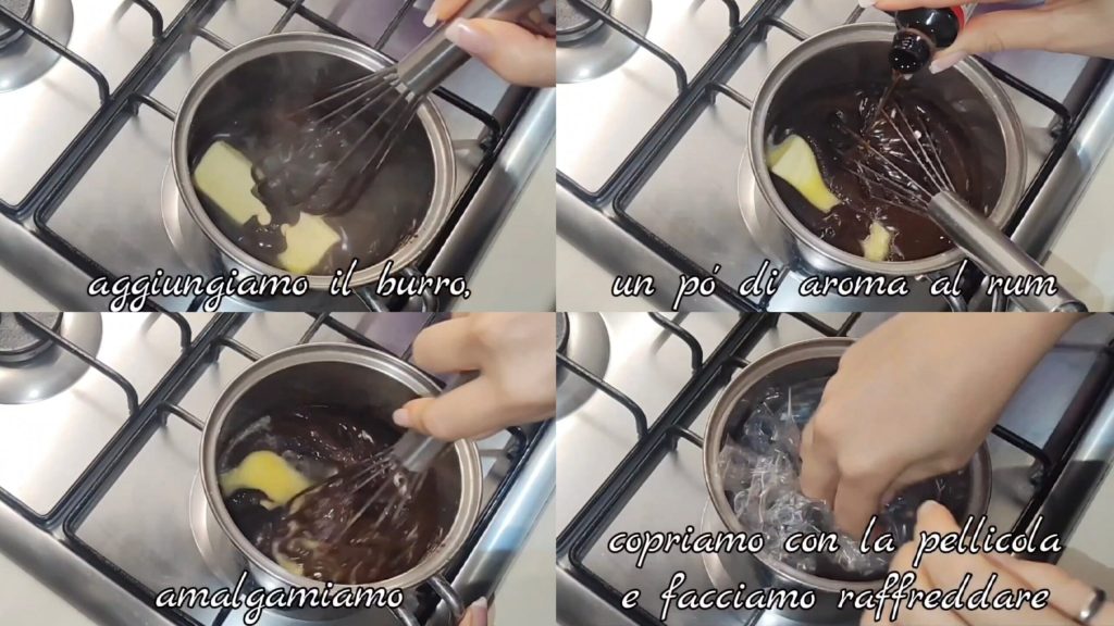 • ajoutez le beurre, l’arôme de rhum et mélangez. Couvrez avec du film plastique et laissez refroidir.