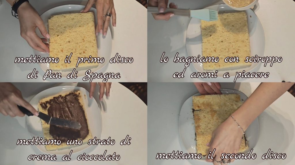 Placez le premier disque de biscuit de Savoie, imbibez-le avec le sirop de sucre et les arômes à votre goût. Ajoutez une couche de crème au chocolat. Ajoutez le deuxième disque de biscuit de Savoie,