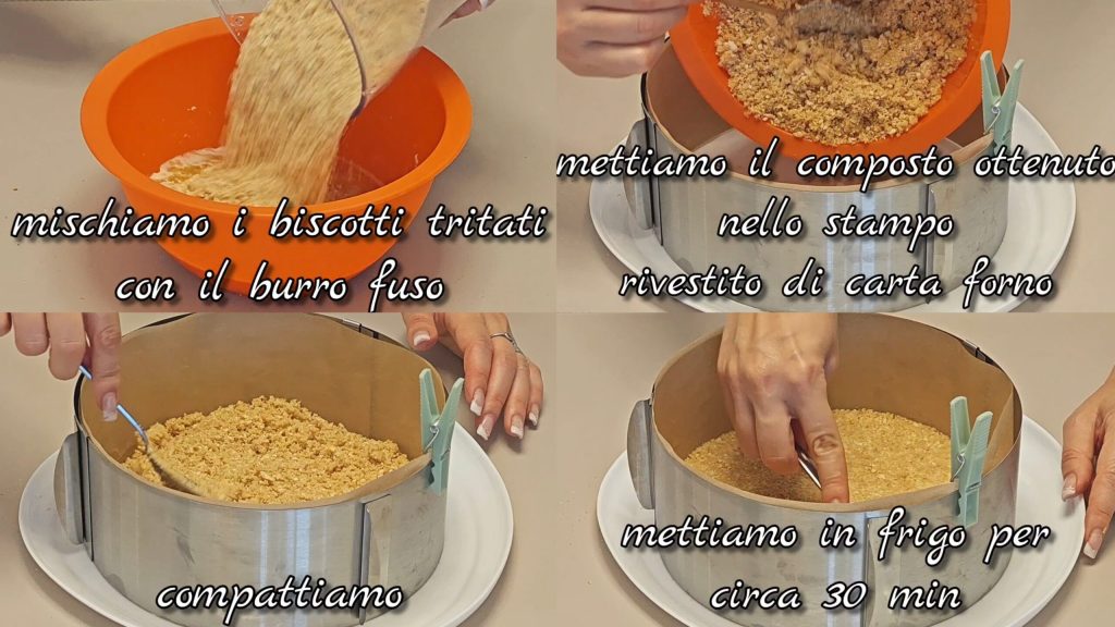 Nous mélangeons les biscuits émiettés avec le beurre fondu. Nous mettons le mélange obtenu dans le moule recouvert de papier cuisson et le compactons. Nous mettons au frigo pendant environ 30 minutes
