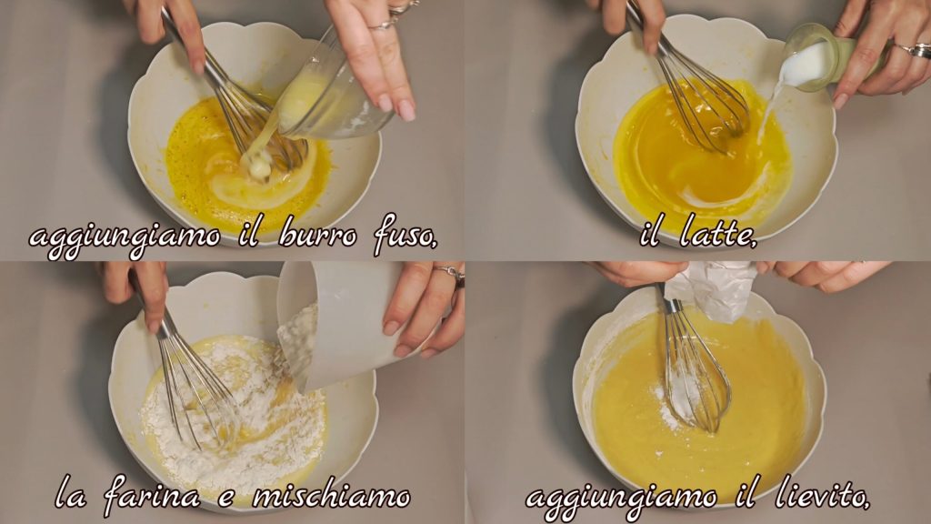 Ajoutons le beurre fondu, le lait, la farine et mélangeons bien. Mettons la levure et mélangeons.