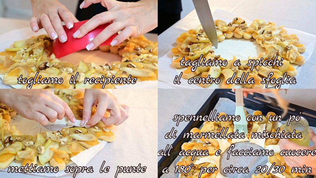 Nous retirons le récipient et coupons le centre de la pâte en quartiers. Nous relevons les pointes. Nous badigeonnons avec un peu de confiture mélangée à de l’eau et faisons cuire à 180° pendant environ 20/30 min.