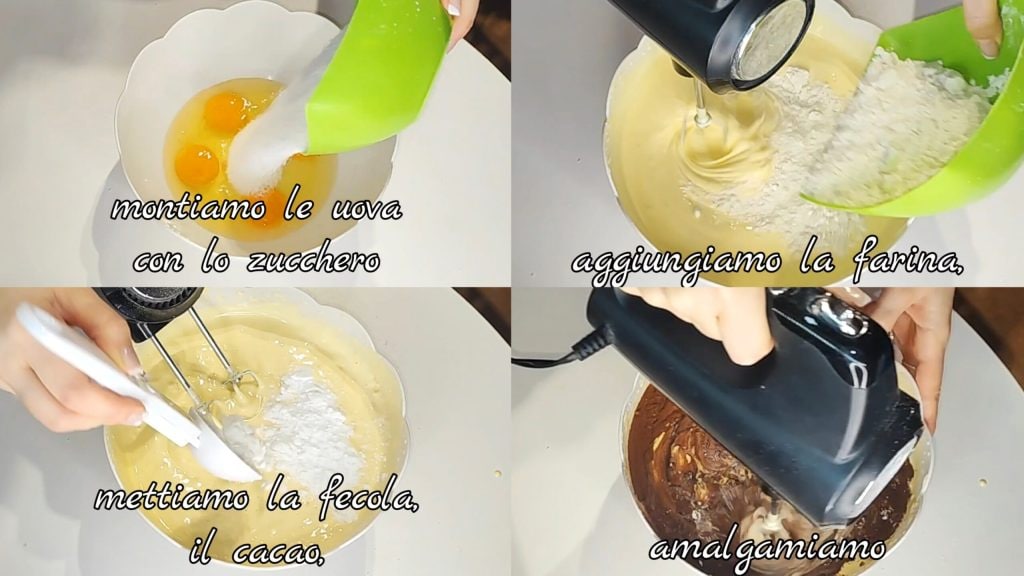 Montez les œufs avec le sucre, nous devons obtenir un mélange clair et crémeux. Ajoutez la farine, la fécule, le cacao et mélangez.