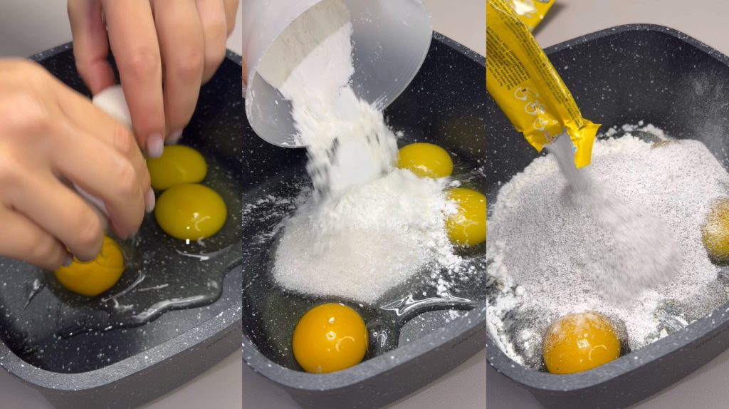 • Dans une casserole, mets les œufs, le sucre, la fécule de maïs et le cappuccino soluble.