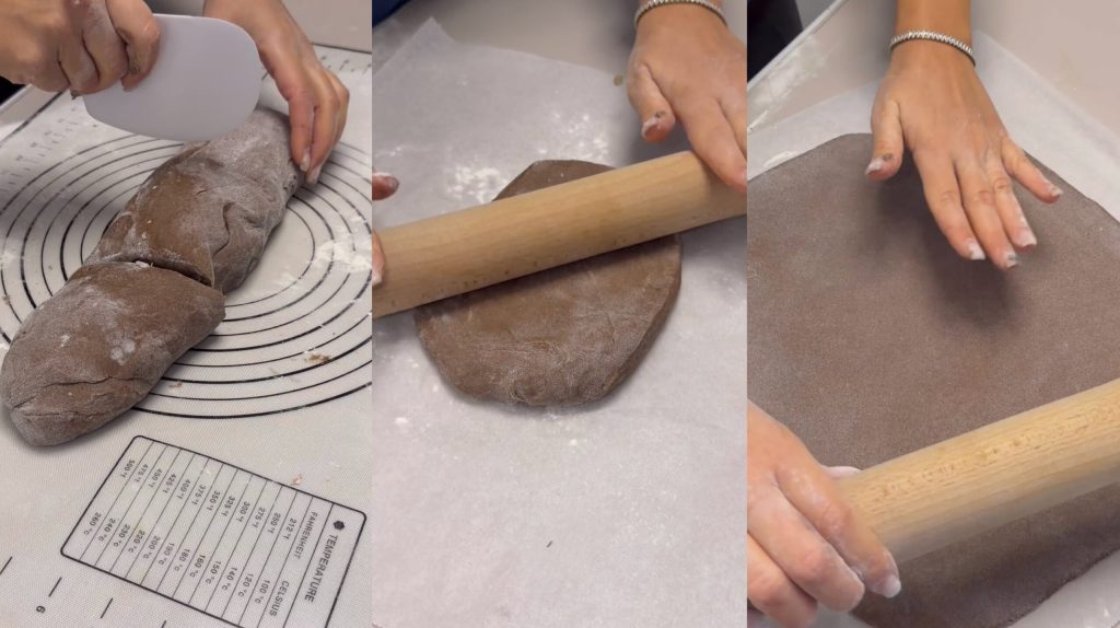 • Divise-la en trois parts égales, étale-les finement en forme de rectangle