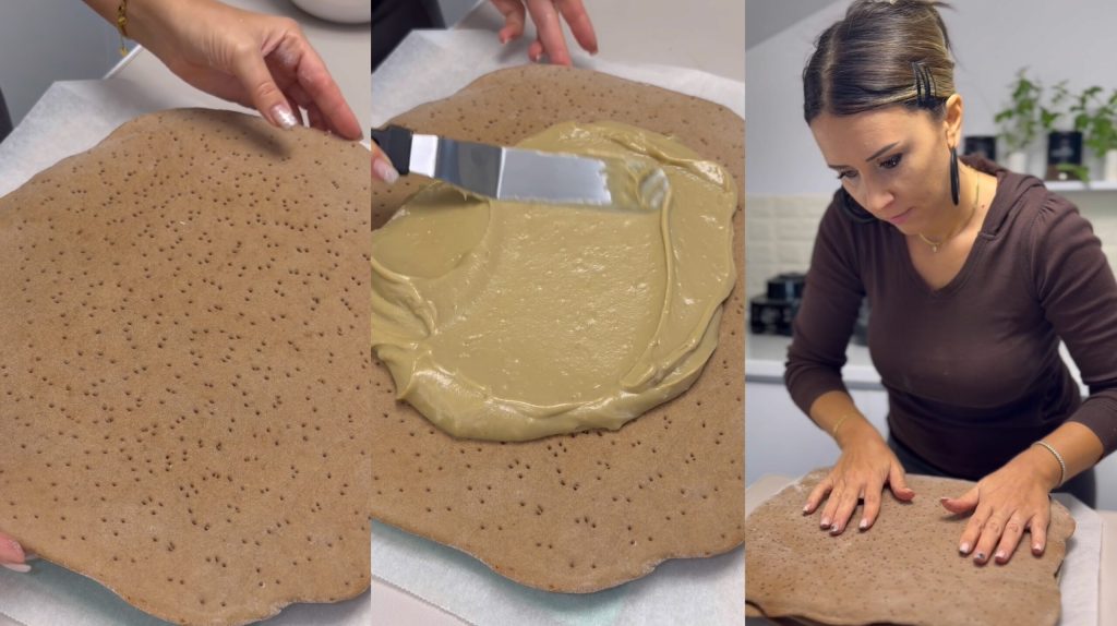 • ajoute le deuxième rectangle et répartis la crème restante. Ferme avec le troisième rectangle, couvre, pose un poids dessus et laisse reposer au réfrigérateur toute la nuit, afin qu’il se raffermisse bien.