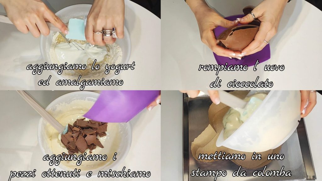 Ajoutez le yaourt et mélangez. Cassez l’œuf en chocolat en morceaux et ajoutez-les au mélange en mélangeant bien. Versez le mélange obtenu dans un moule en forme de colombe.