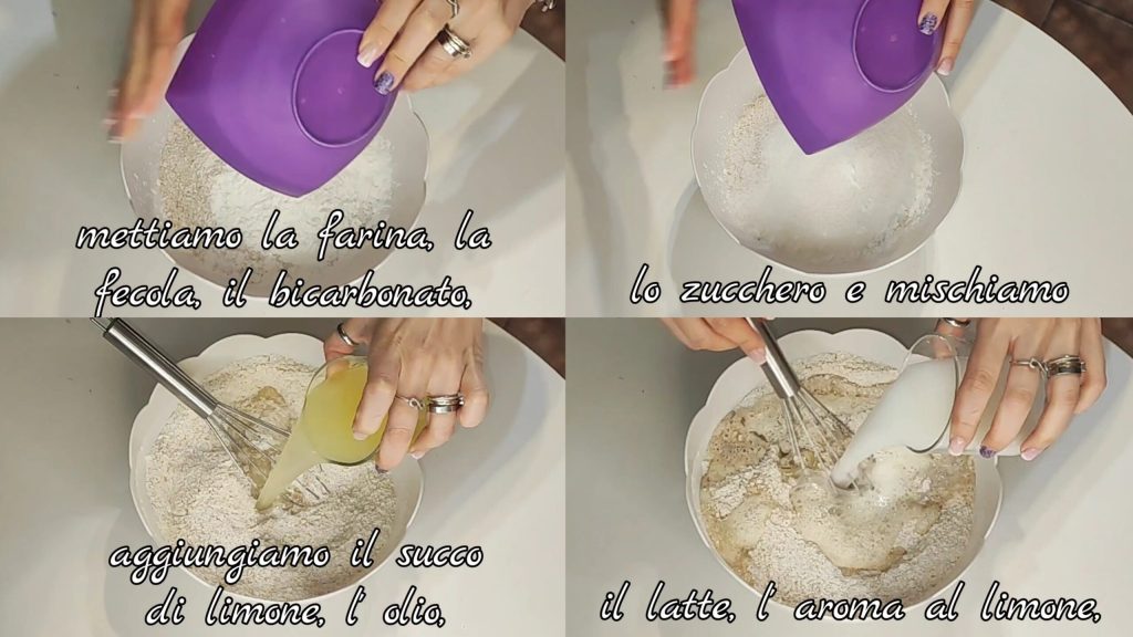 Dans un récipient, mettons la farine, la fécule, le bicarbonate, le sucre et mélangeons. Ajoutons le jus de citron, l’huile, le lait, l’arôme de citron.