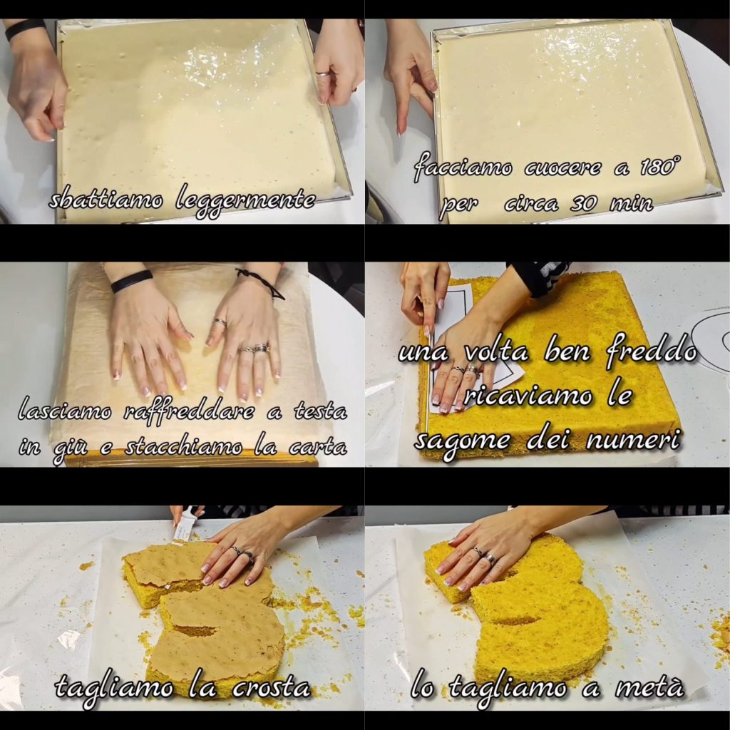 Faites cuire à 180° pendant environ 30 minutes. Laissez refroidir à l’envers et détachez le papier cuisson collé pendant la cuisson. Une fois froid, découpez les formes des chiffres. Coupez la croûte puis coupez à mi-hauteur.