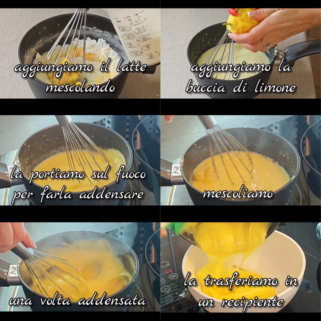 Ajoutez le lait en mélangeant. Ajoutez le zeste de citron et mettez sur le feu pour faire épaissir tout en mélangeant. Une fois épaissie, transférez-la dans un récipient,