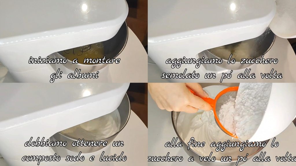 Commencez à monter les blancs d’œufs et ajoutez le sucre semoule petit à petit. Nous devons obtenir un mélange ferme et brillant. Enfin, ajoutez le sucre glace tamisé petit à petit