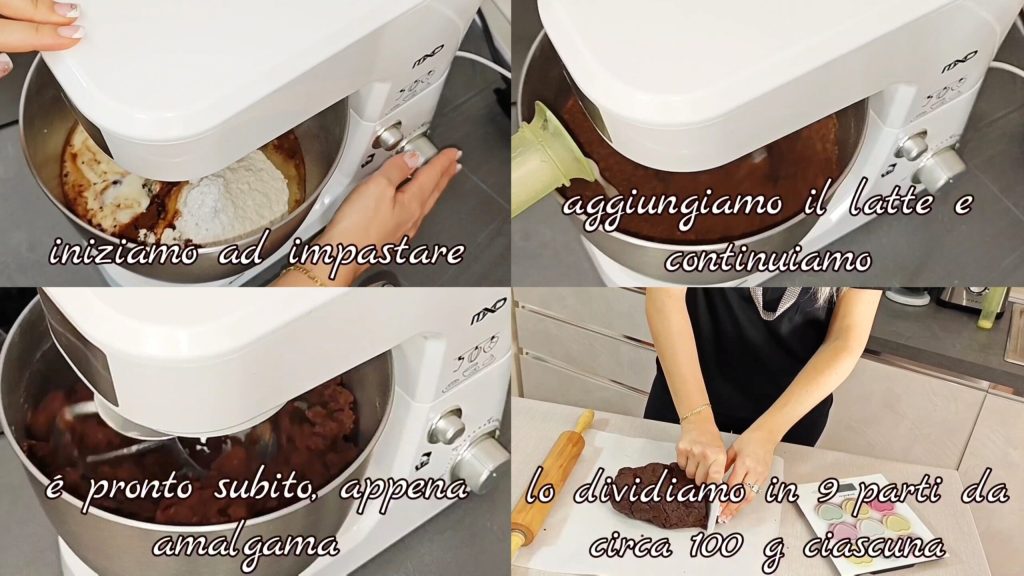 commençons à pétrir. Ajoutons le lait et continuons quelques secondes. La pâte est prête dès qu’elle est homogène. Nous la divisons en 9 parts d’environ 100 g chacune.