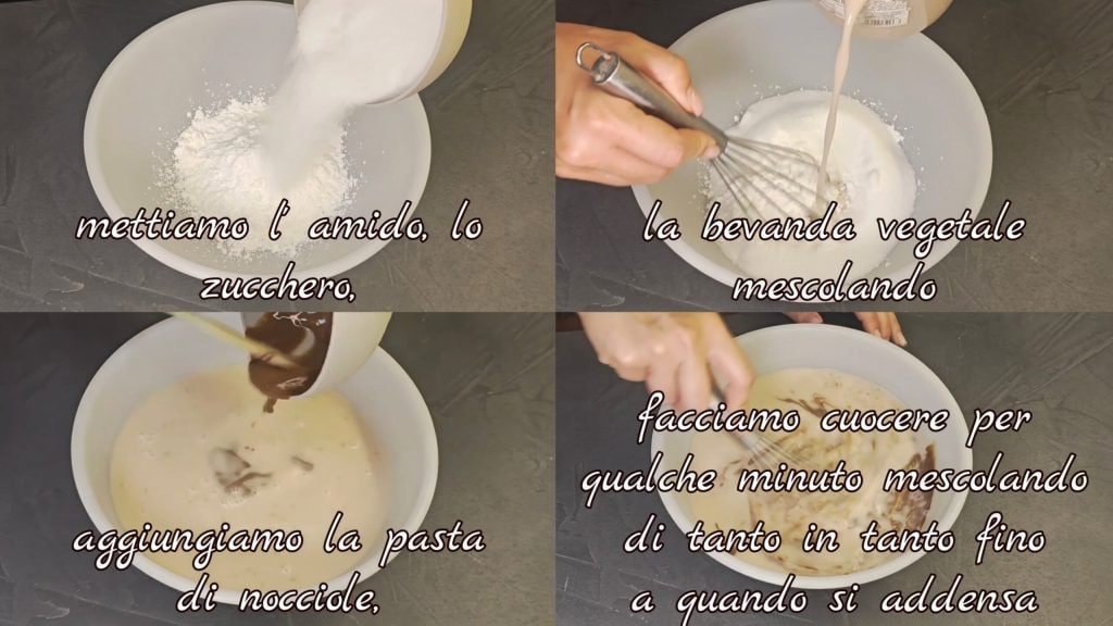 Dans un récipient, nous mettons l’amidon, le sucre et ajoutons la boisson à la noisette en mélangeant. Nous ajoutons la pâte de noisettes et faisons cuire quelques minutes jusqu’à ce que la crème épaississe en mélangeant de temps en temps.