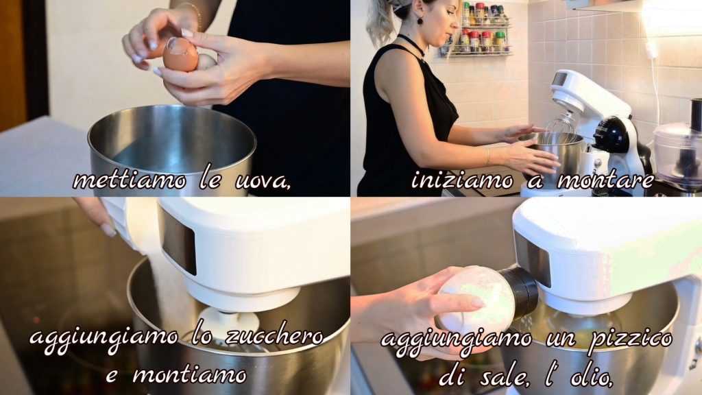 Commencez par monter les œufs, ajoutez le sucre et continuez. Ajoutez une pincée de sel, l’huile,