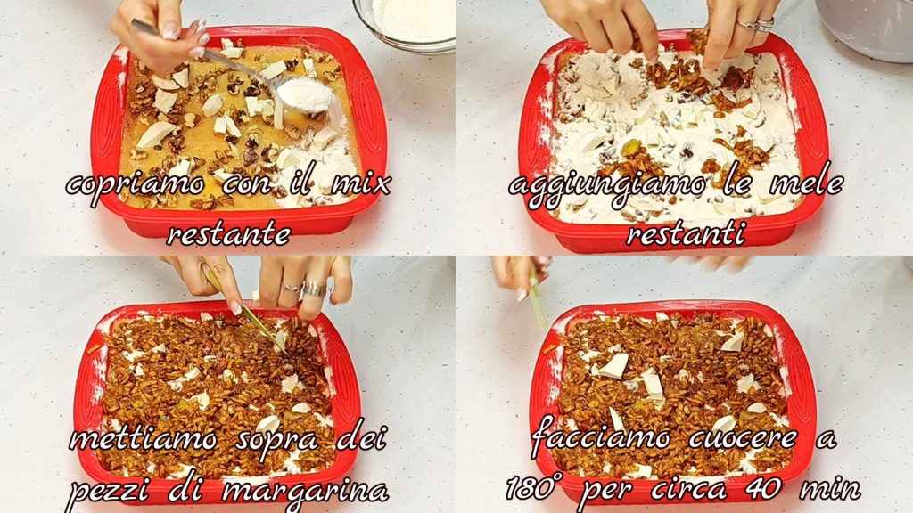• Couvrons avec le mĂ©lange de poudres restant, les pommes restantes, encore quelques morceaux de margarine et faisons cuire Ă  180° pendant environ 40 min.