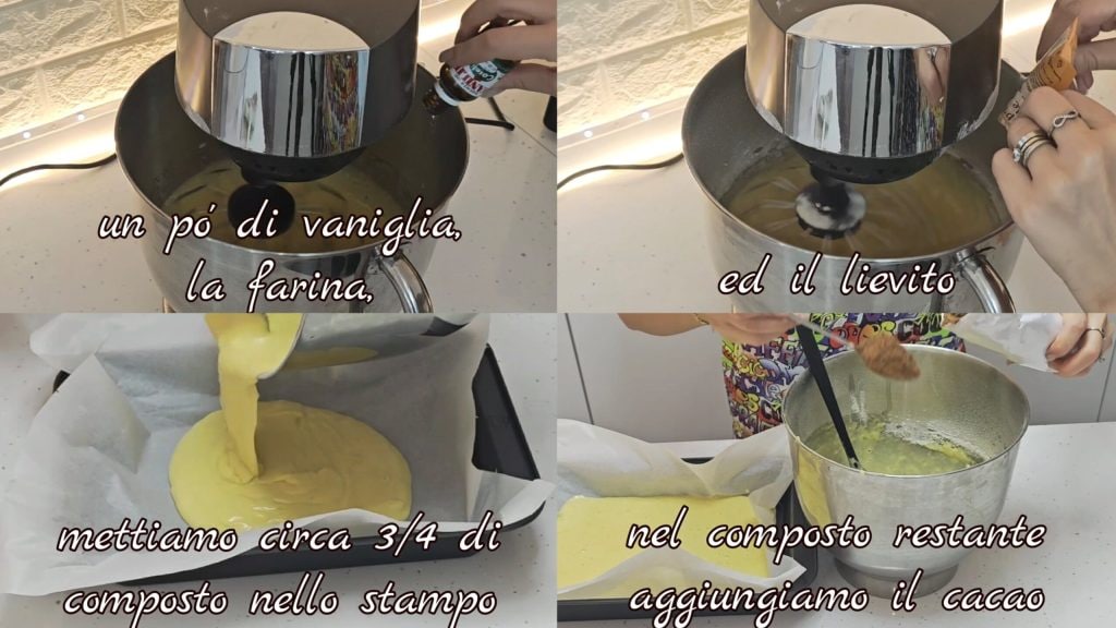 Ajoutez un peu de vanille, la farine et la levure. Versez environ 3/4 du mélange obtenu dans le moule avec le papier sulfurisé à l’intérieur. Dans le mélange restant, ajoutez le cacao,