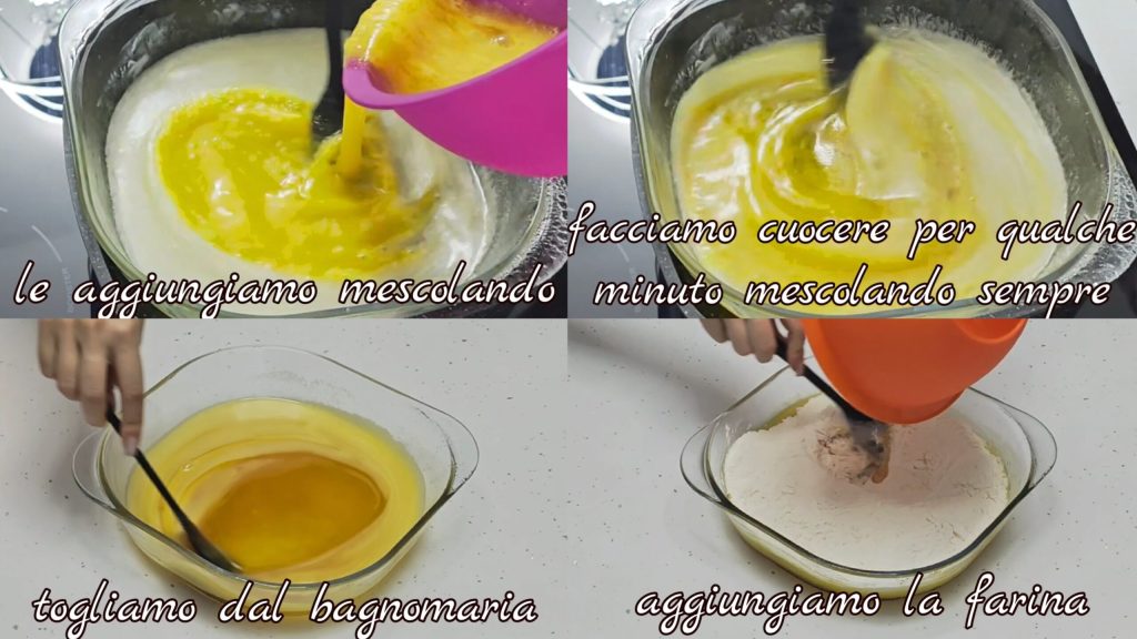 Ajoutons-les en mélangeant, cuisons pendant quelques minutes en mélangeant toujours. Retirons du bain-marie et ajoutons la farine.
