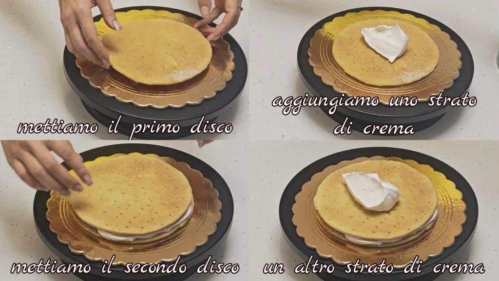 mettons le premier disque. Ajoutons une couche de crème, un autre disque, encore une couche de crème,