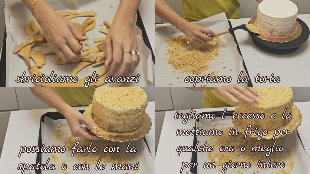 Emiettons les restes et couvrons tout le gâteau. Nous pouvons le faire avec les mains ou en utilisant une spatule. Retirons l’excédent et mettons-le au frigo pendant quelques heures ou mieux encore pour une journée entière.