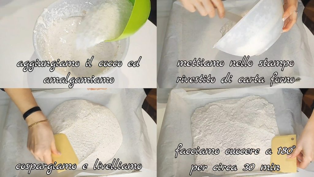 Ajoutons la noix de coco et mélangeons bien. Mettons le mélange obtenu dans le moule tapissé de papier sulfurisé, saupoudrons et nivelons délicatement puis faisons cuire à 180°C pendant environ 30 min.