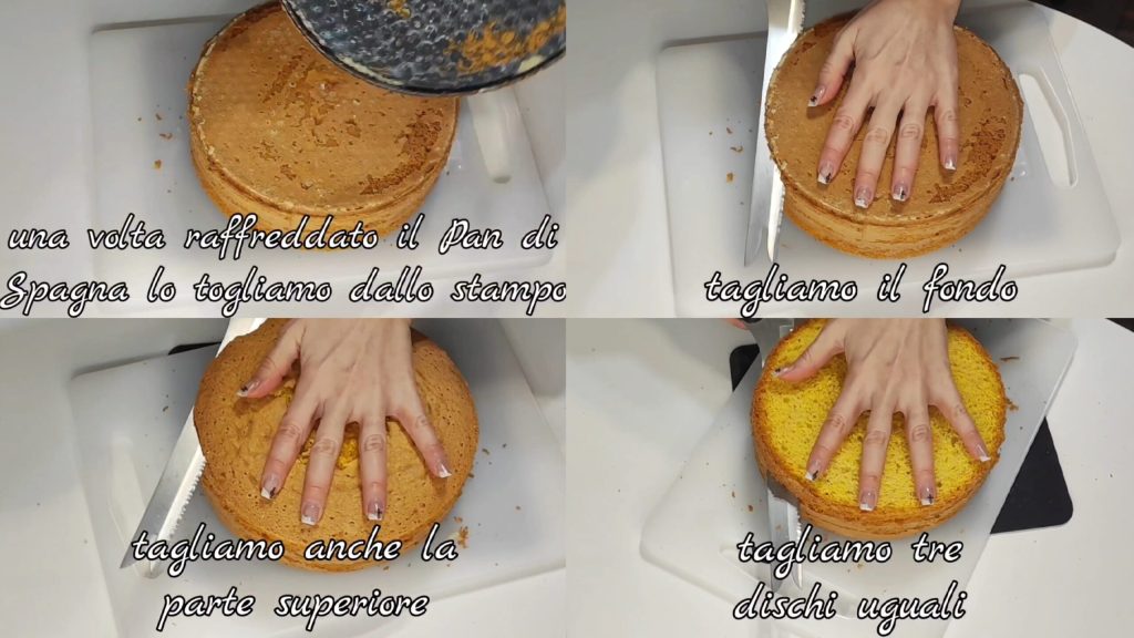 Une fois la génoise bien refroidie, démoulez-la. Coupez la croûte en dessous et au-dessus, puis coupez trois disques égaux.