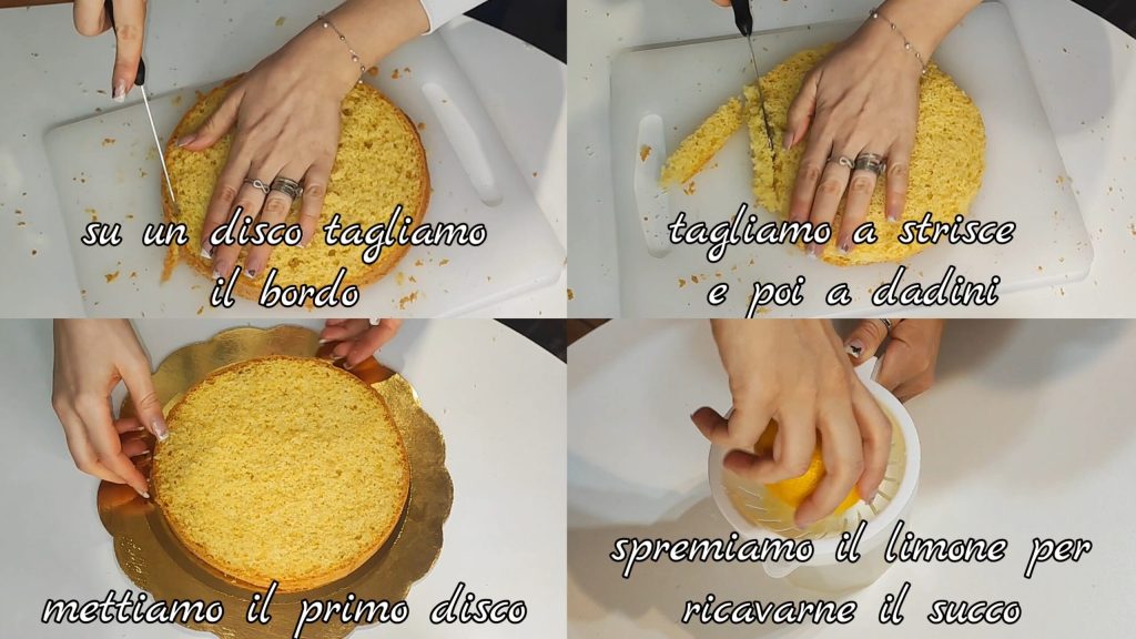 À un disque, coupons le bord, le coupons en bandes puis en petits dés. Mettons le premier disque de génoise. Pressons le citron pour en extraire le jus.