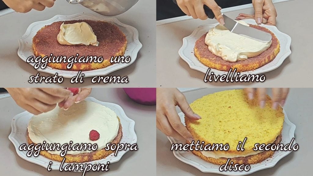 Ajoutez une couche de crème et nivelez. Mettez le deuxième disque de biscuit génoise par-dessus,