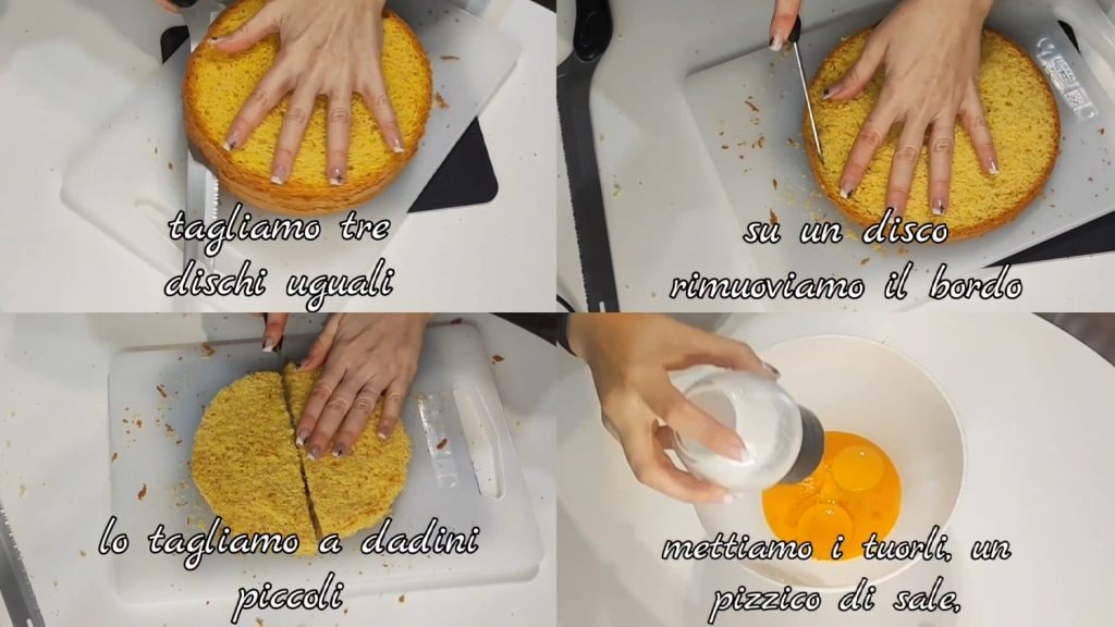 ensuite coupons 3 disques égaux. Sur un disque, coupons également le bord puis coupons-le en petits cubes. Dans un récipient adapté à la cuisson au micro-ondes, mettons les jaunes d’œufs, une pincée de sel.