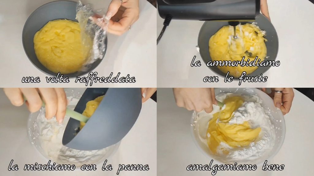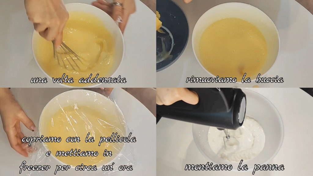 Une fois épaissie, retirons le zeste, couvrons avec du film alimentaire et mettons-la (si possible) au congélateur pendant environ une heure pour la refroidir rapidement et éviter la montée de la charge microbienne ! Si vous ne pouvez pas la mettre au congélateur, mettez-la à refroidir au réfrigérateur ou dans un récipient avec de l’eau et de la glace ! Pendant ce temps, montons la crème.